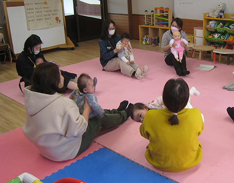 0、1歳児をもつ保護者を対象に子育てに関する情報交換や親子のふれあいを大切にしています。絵本の読み聞かせや親子でのあそびなどを通して楽しい子育てができるよう支援を行っています。また、教室の中で、離乳食の実習を通し、食の大切さや歯の大切さを学ぶことができます。