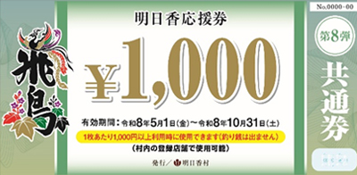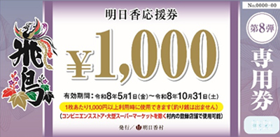世帯主あてに明日香応援券を郵送します。なお、明日香応援券は再発行できませんので紛失等にご注意ください。