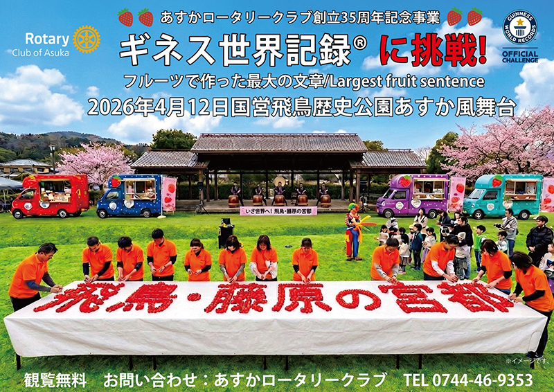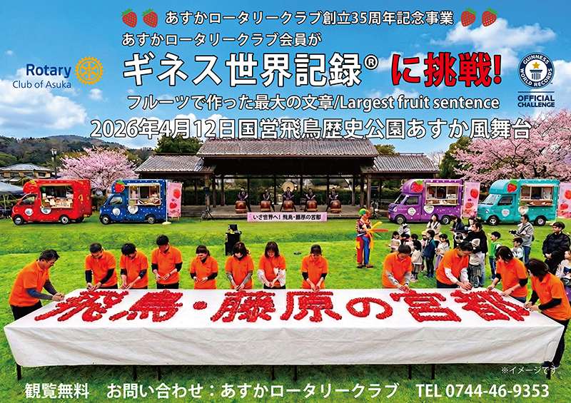当日は、明日香村特産のいちご「あすかルビー」を使ったギネス世界記録への挑戦をはじめ、和太鼓演奏、マジックショー、バルーンアートなど子どもから大人まで楽しめるイベントが行われます。